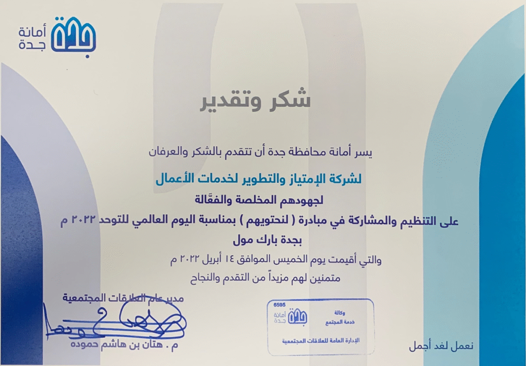 تتقدم إدارة جمعية المستقبل لرعاية الايتام بضباء بجزيل الشكر والامتنان لشركة الامتياز والتطوير لخدمات الاعمال ، وذلك لما يملكونه من خبره ومهارة وتميز في إدارة التسويق لمشروع افطار الصائم لعام ١٤٤٣ هـ لصالح أيتام الجمعية ، ونتطلع لمزيد من التعاون والشركات بين المؤسسة والجمعية لما فيه تقديم خدمة لفئة غالية على قلوبنا جميعا