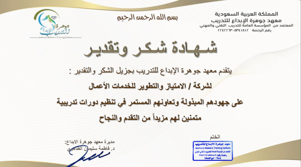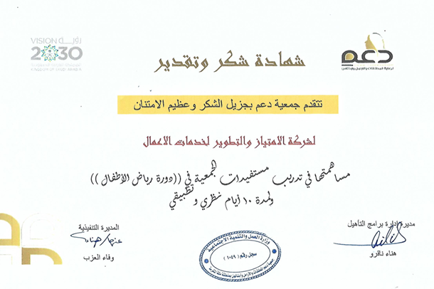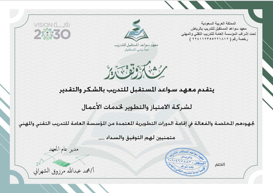 نشكر القائمين على الشركة من طاقم إداري وتعليمي وداعم على الجهود المباركة التي نرجو ان تتكلل دائما بالنجاح