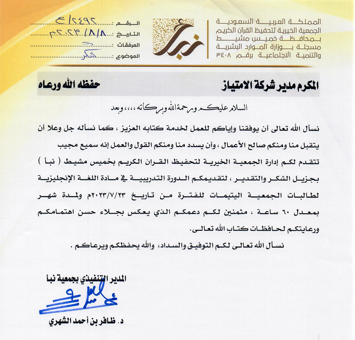 في بداية الامر احب ان اتقدم بالشكر الجزيل بعد شكر الله سبحانه وتعالى بإسمي وبإسم رئيس مجلس الادارة لاخي الدكتور / محمد علي الزهراني رئيس مجلس الادارة في شركة الامتياز والتطوير لخدمات الأعمال ، فمن خلال تعامل الجمعية مع الشركة في مجال التسويق للجمعية ، كانت التجربة رائعة ومميزة وليس هذا بمستغرب من سعادة الدكتور محمد وجميع العاملين معه في هذا المجال ، فلهم من الشكر اجزله ومن الثناء اعطره داعين الله ان يوفقهم ويبارك في جهودهم .