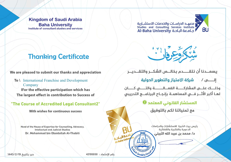 لقد تشرفت بالعمل معكم في البرامج التدريبية ولمست فيكم الابداع والتطور في جميع المجالات في جو من الإخاء مفعم بالنشاط والحيوية متمنيا لشركتكم النجاح والرقي دائما مقدرا عطائكم المستمر في سبيل تقديم أرقى وأميز البرامج التي تعود على الفرد والمجتمع والوطن بالفائدة والتقدم.